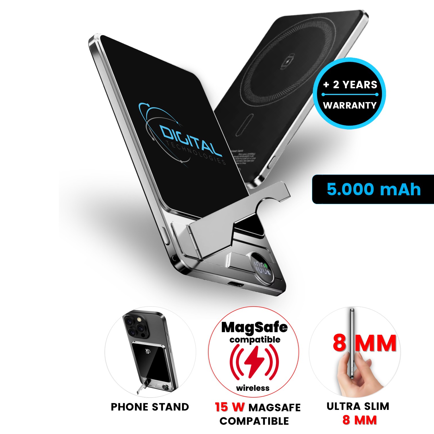 5000 mAh ultratenká magnetická kovová powerbanka QUANTUM 3 v 1 s 15 W bezdrôtovým nabíjaním a PD 20 W